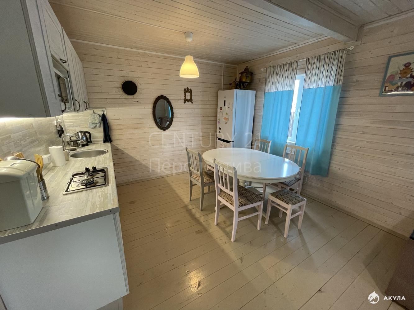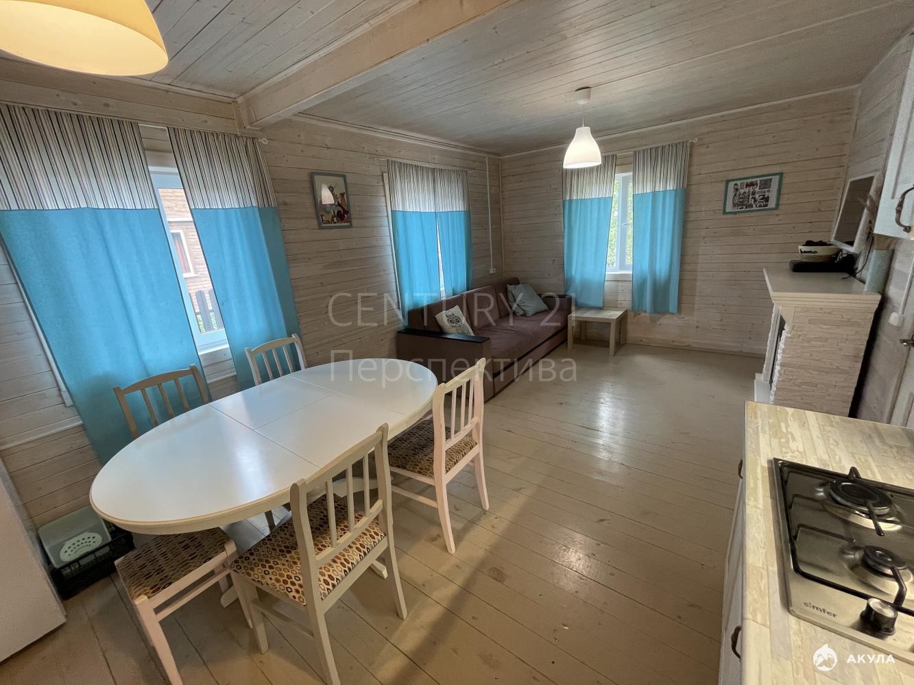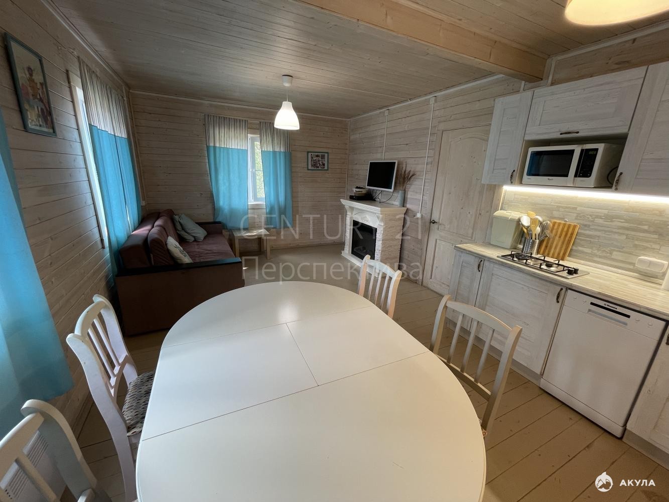 Просторный холл, большая кухня -гостиная, 2 спальни, камин.
